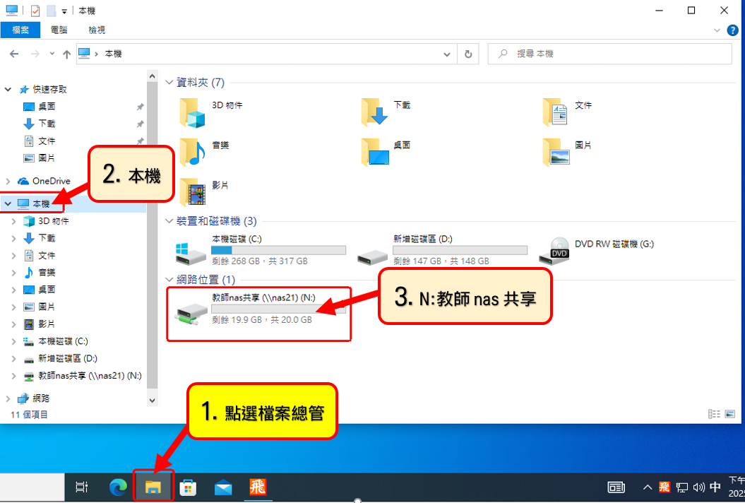 ◎校內主機不用網頁方式,請直接點>1.檔案總管>2.選本機,>3.N:碟進入使用。