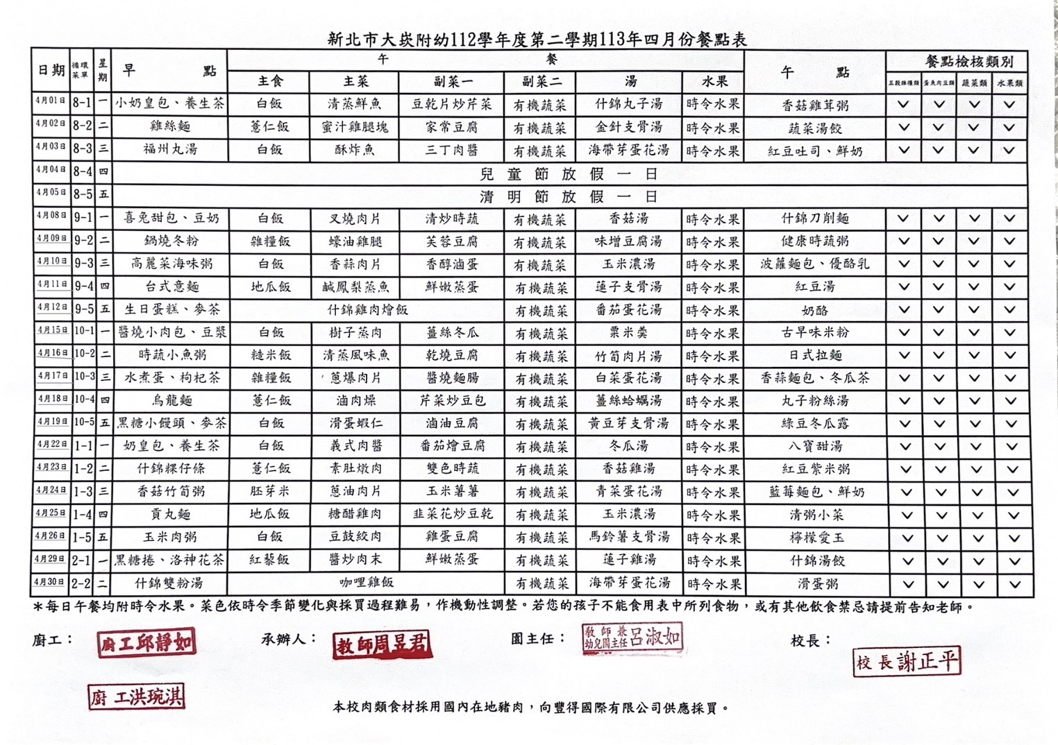 112-2大崁附幼4月份餐點表 - 多元、適性、全人、關懷